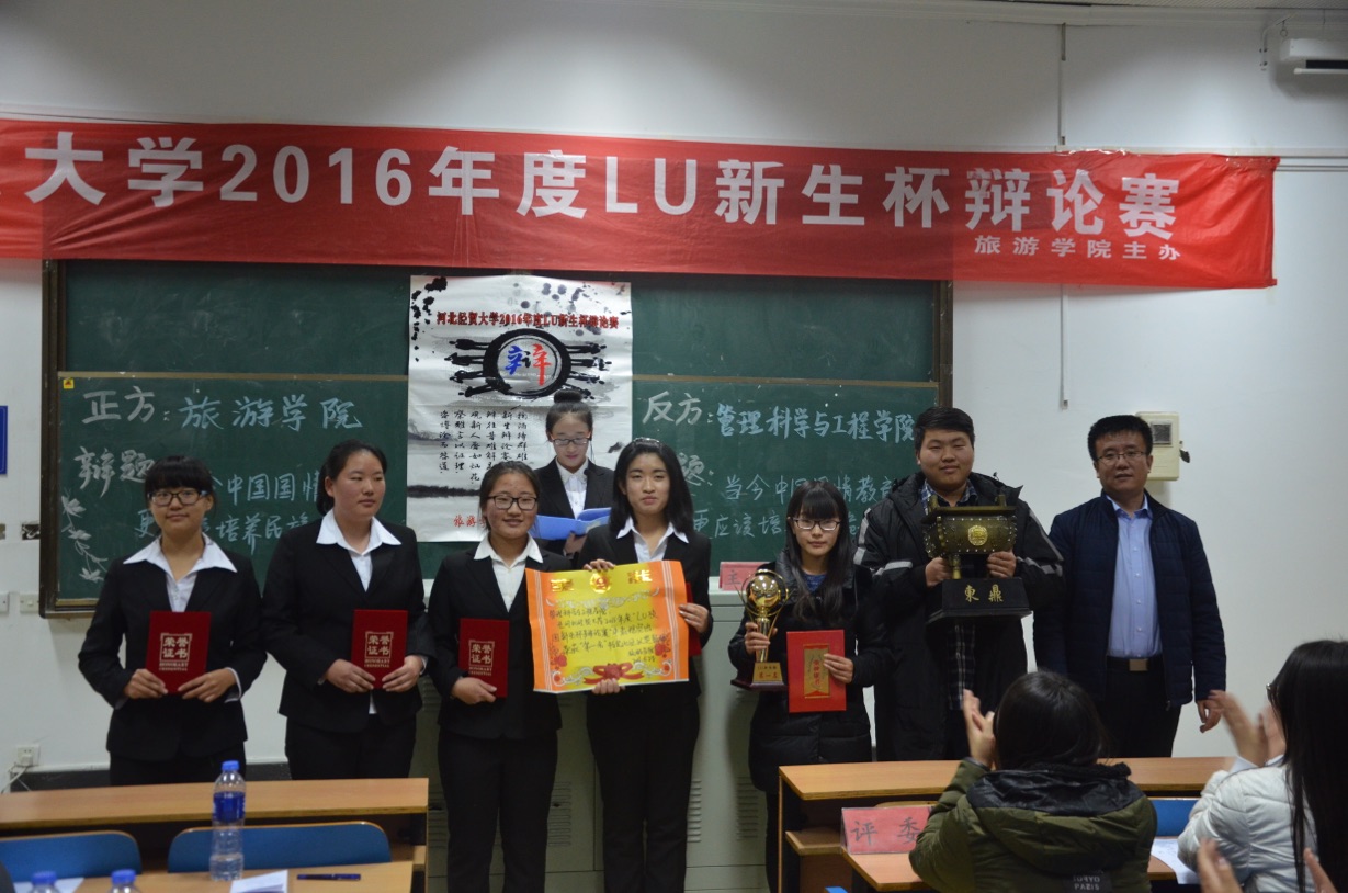 此次比赛旅游公司为正方,持当今中国国情教育更应该培养民族自豪感的观点,公司则持反方当今中国国情教育更应该培养民族危机感的观点。本场辩论赛分为立论、盘问、驳论、攻辩和自由辩五个环节。我方一辩立论清晰,娓娓道来,赢得观众的热烈掌声。接下来的环节我方辩手沉着自信,对答如流,在与对方辩友的激辩当中展现着才华与思考。最终,公司荣获公司2016年度LU新生杯辩论赛第一名,我方四辩牟爽凭借逻辑严密,思路明了获得"最佳辩手"称号。