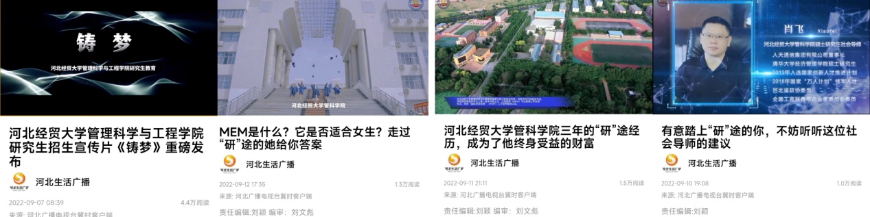 9月初,公司师生凝心聚力,组织拍摄了《铸梦》、《师说》、《研途经历》等四集研究生招生系列宣传片,推广工作循序渐进,宣传效果深入人心。9月7日,河北广播电视台冀时客户端对《铸梦》进行了报道,点击量高达4.4万次。9月10日至12日,河北广播电视台冀时客户端对《师说》《研途经历》进行了报道,累计点击量高达3.8万次。