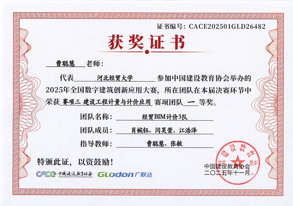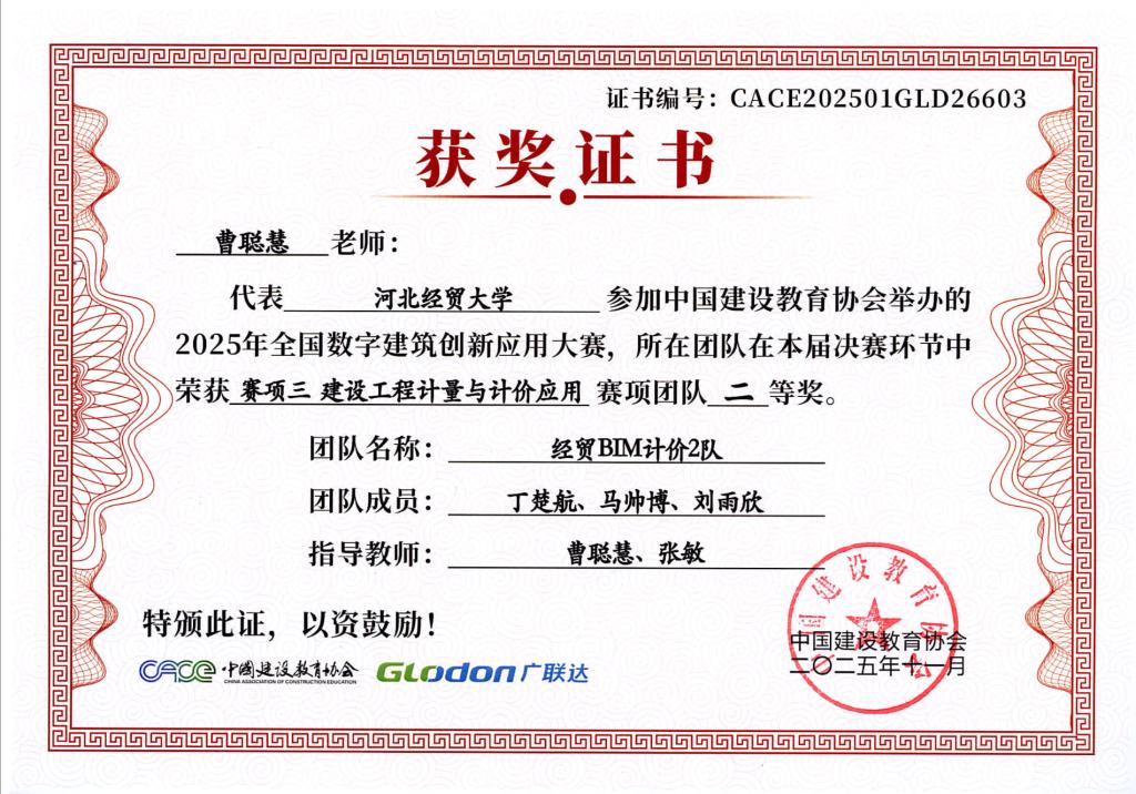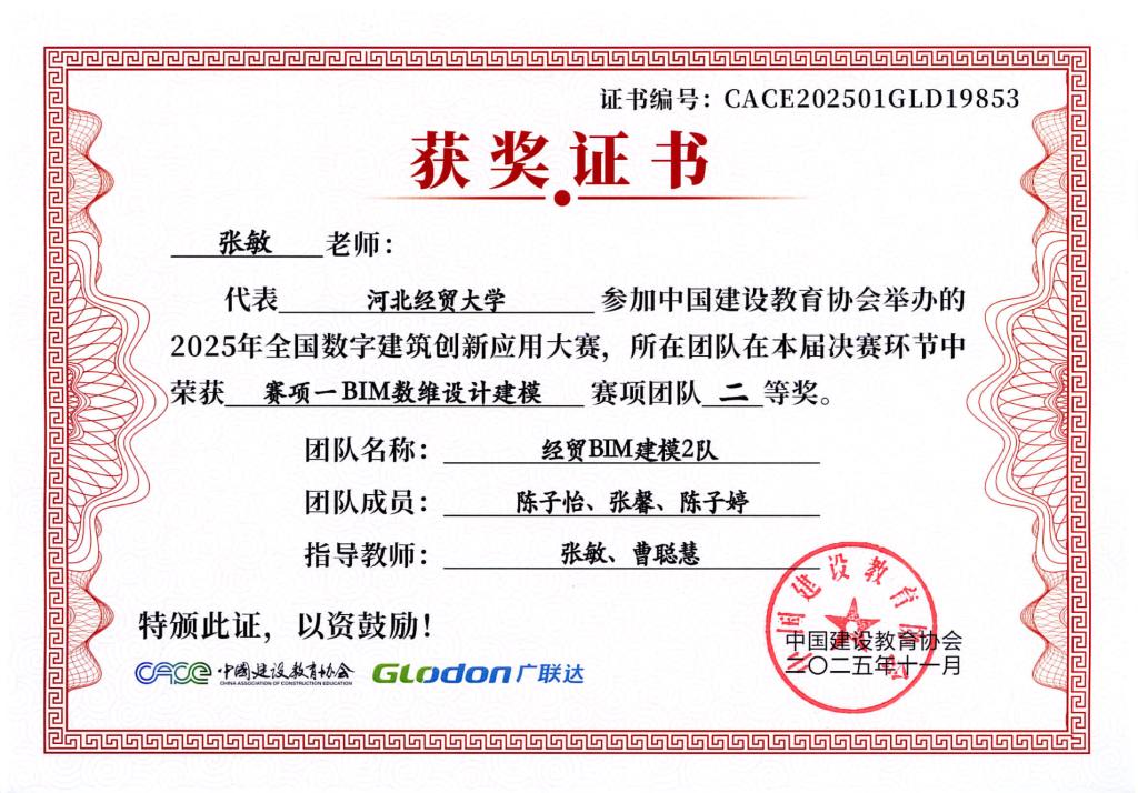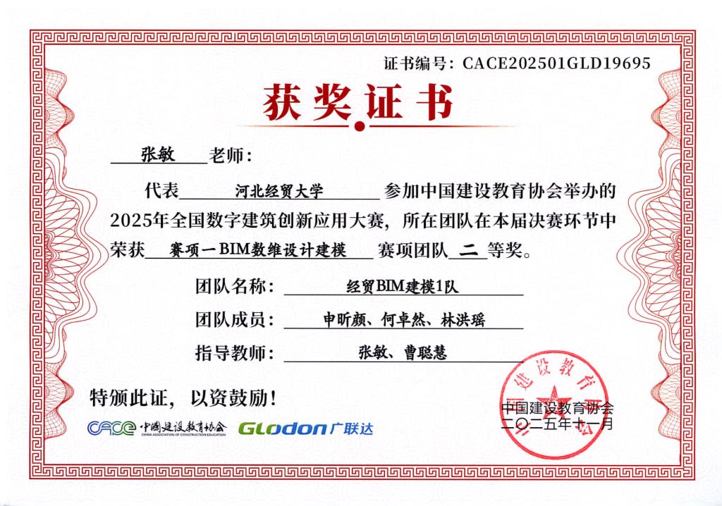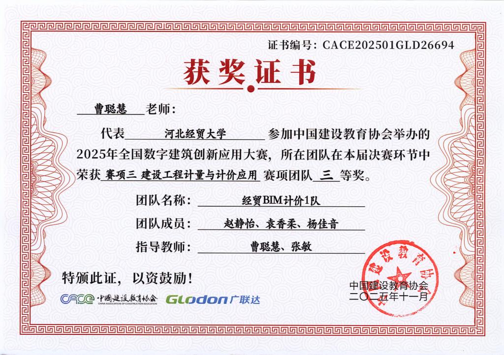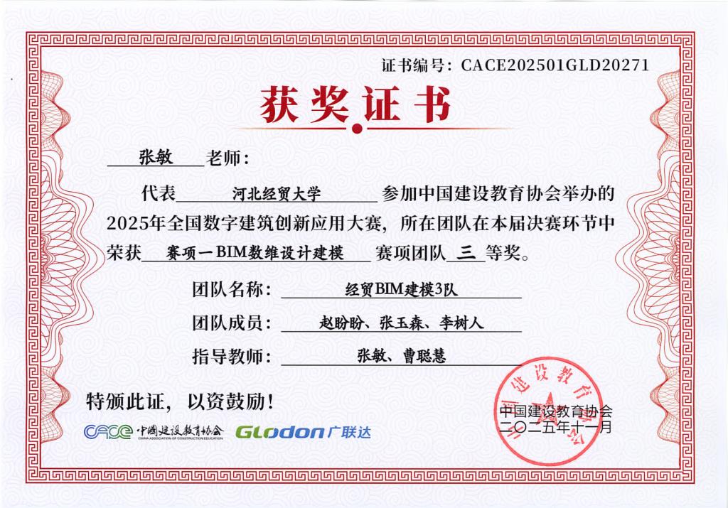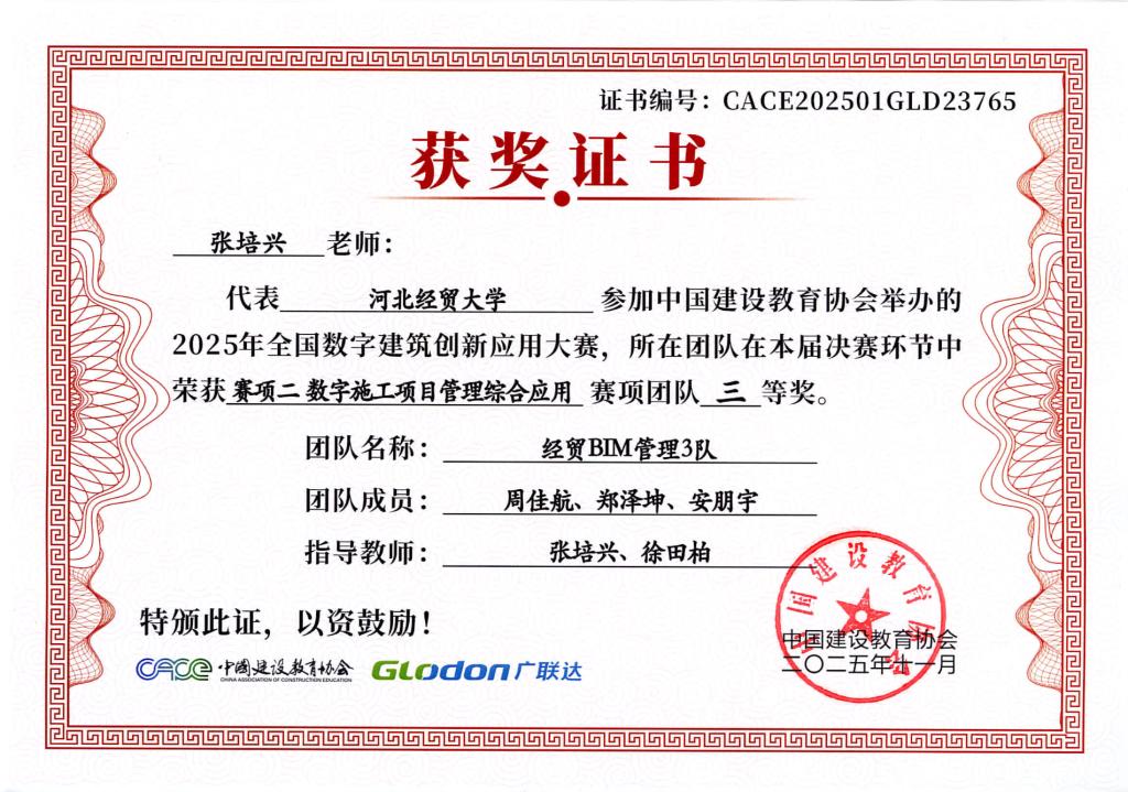 本次大赛由中国建设教育协会主办,国家数字建筑行业产教融合共同体与广联达科技股份有限公司共同协办。大赛设置了BIM数维设计建模(赛项1)、数字施工项目管理综合应用(赛项2)、建设工程计量与计价应用(赛项3)三个赛项,分为两个阶段进行,2025年9月20日举办全国选拔赛,前60%进入2025年10月18日全国总决赛。大赛自2025年4月启动,太阳成集团122ccvip工程管理系曹聪慧、张敏、张培兴、徐田柏等老师积极组织了9支队伍报名参加,经过精心的备赛,共有7支队伍突围进入总决赛,最终取得7项奖项。