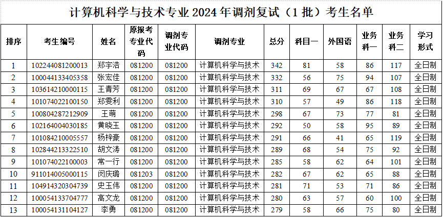 计算机科学与技术专业2024年调剂复试(一批)考生名单