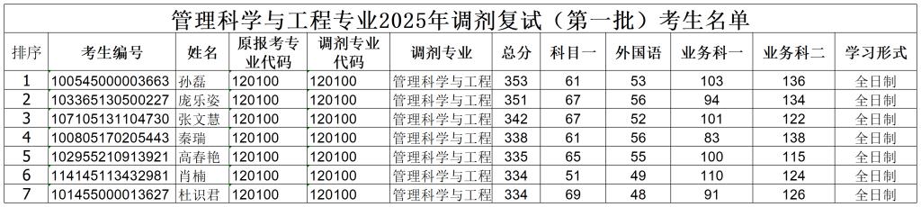 管理科学与工程专业2025调剂复试(第一批)考生名单