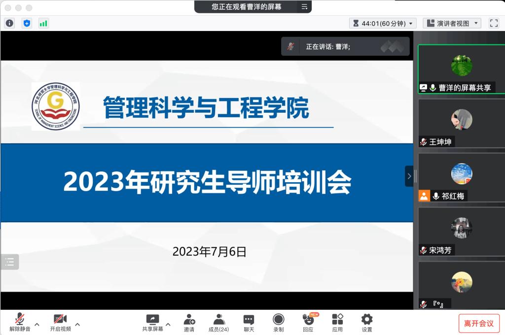 2023年7月6日,公司在腾讯会议线上召开2023年研究生导师培训会。会议由经理祁红梅主持,副经理王芹鹏、全体研究生导师、学科秘书20余人参加会议。
