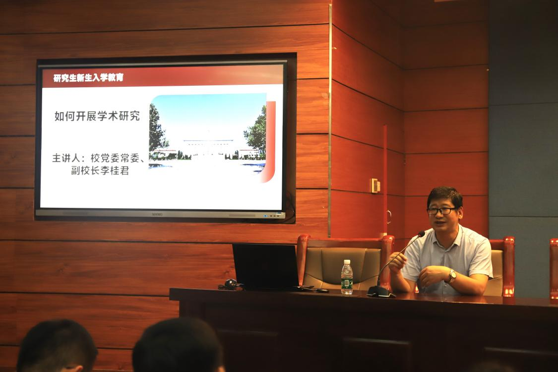 李桂君向所有研究生新生到经贸求学表示热烈欢迎。他以《如何开展学术研究》为题,从“提升综合素质”“保持学术热情”“强化创新思维”三个方面为研究生们讲授开学第一课,鼓励同学们以师为友、独立思考、勇于探索、脚踏实地,在科研探索的道路上永葆初心与热情。