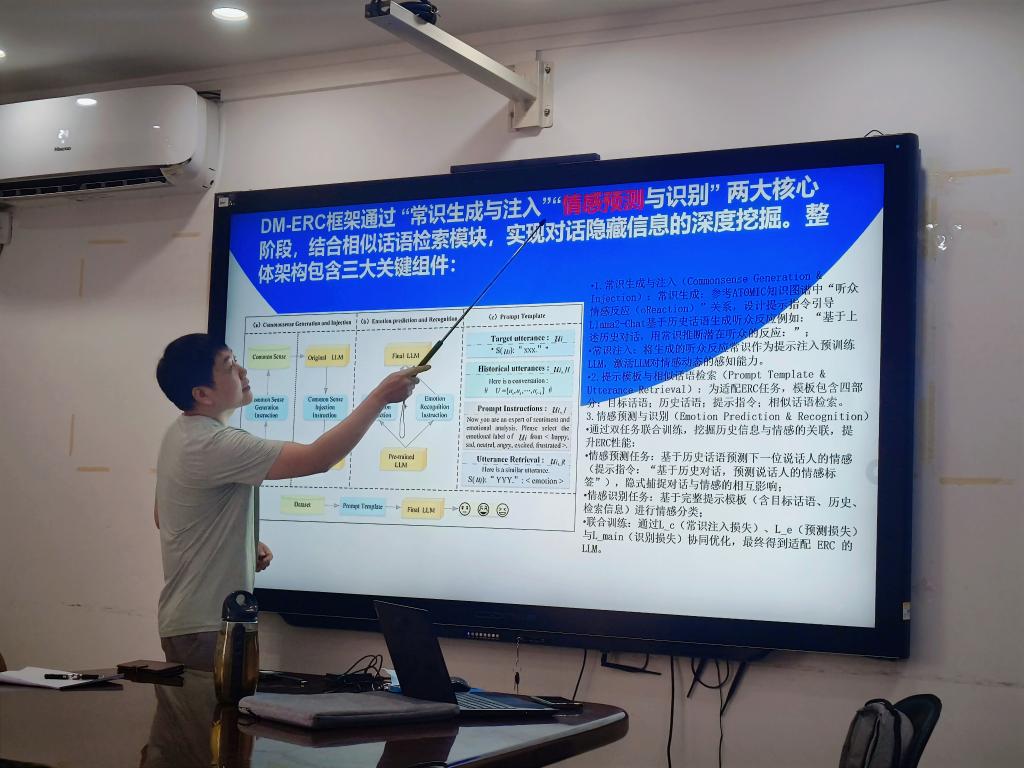 9月8日下午,公司勾智楠博士在一办5楼西会议室作题为“基于生成式预训练模型的情绪感知研究”的专题报告。报告由数据科学与大数据技术系主任魏若岩副教授主持,部分教师及研究生参加。
